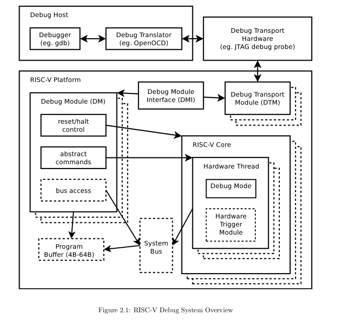 RISC-Vでは、RISC-V Debug ModeRISC-V debug spec が定義されている。 この仕様では、デバック用の機能をまとめており、gdbなどはこの機能が実装されていることを前提としている。 オレオレの仕様でも良さそうではあるけれど、ツールをの移植など対応させるのが非常にめんどうくさい。 そこで、RISC-V Debugに沿った実装を行う。 これは、通信のプロトコルについては規定していない。 プロトコルはJTAGやSWDなどいろいろあるが、大体はOpenOCDが頑張ってくれる。 Intel FPGAの場合は、Virtual JTAGがあって、デザインの中でインスタンス化すると、USB Blasterケーブルを通してモジュールと通信できるよう。