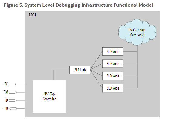 よって、アプリケーションはsld_hubを介して、ユーザロジックのVJTAGインスタンス(sld_node)へアクセスする。