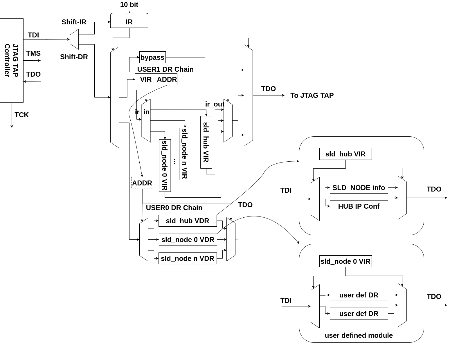 Shift_DR, Shift_IRにてシフトレジスタをシフトする。 Shift_DRの場合は、IRの値に応じて、DRが選択され、シフトされる。 TDIはMSBへ、LSBはTDOへ接続される。 Shift_IRはIRをシフトする。 TDIはMSBへ、ステータス(IRの値ではないことに注意)のLSBはTDOへ接続される。
