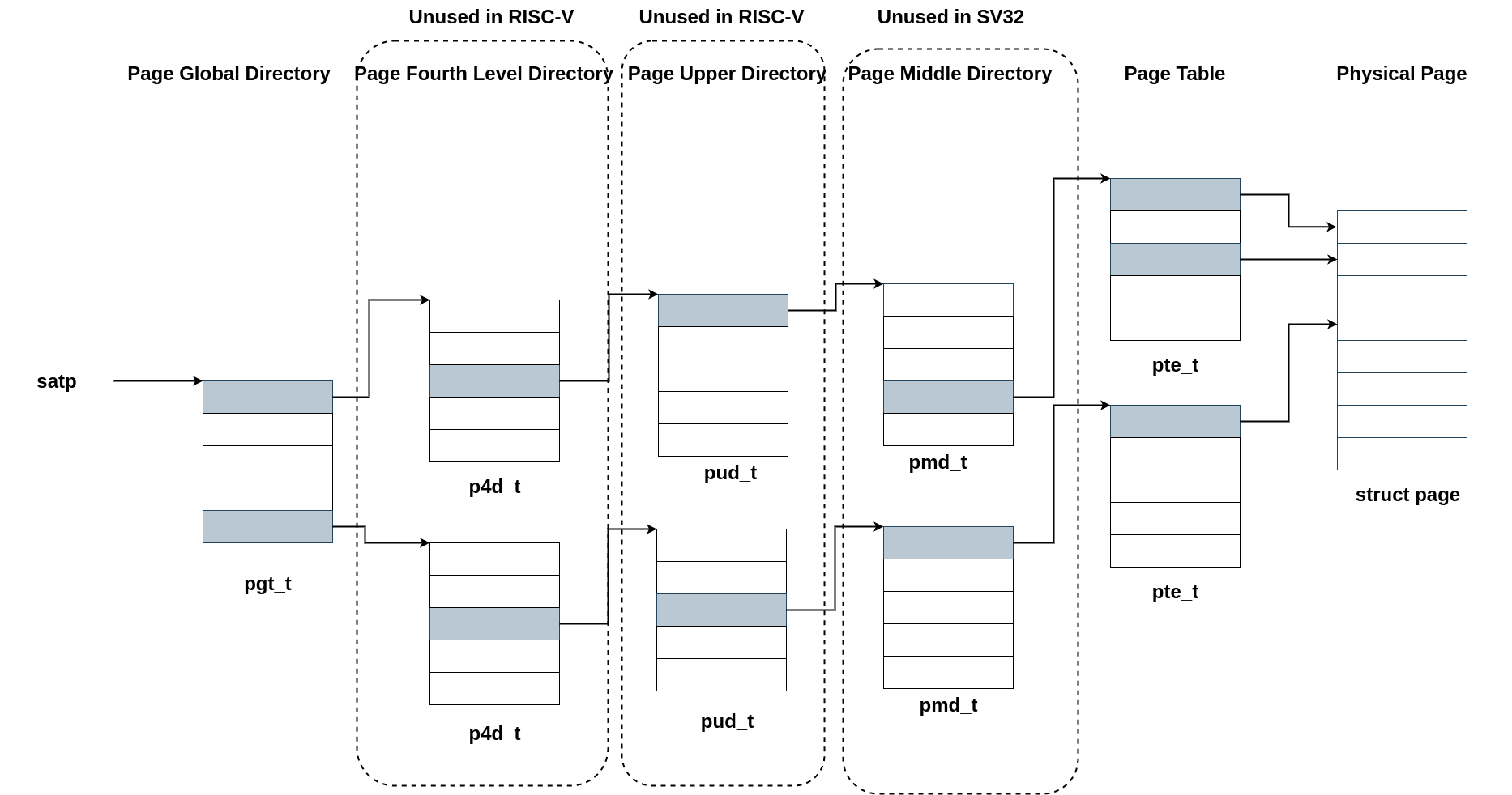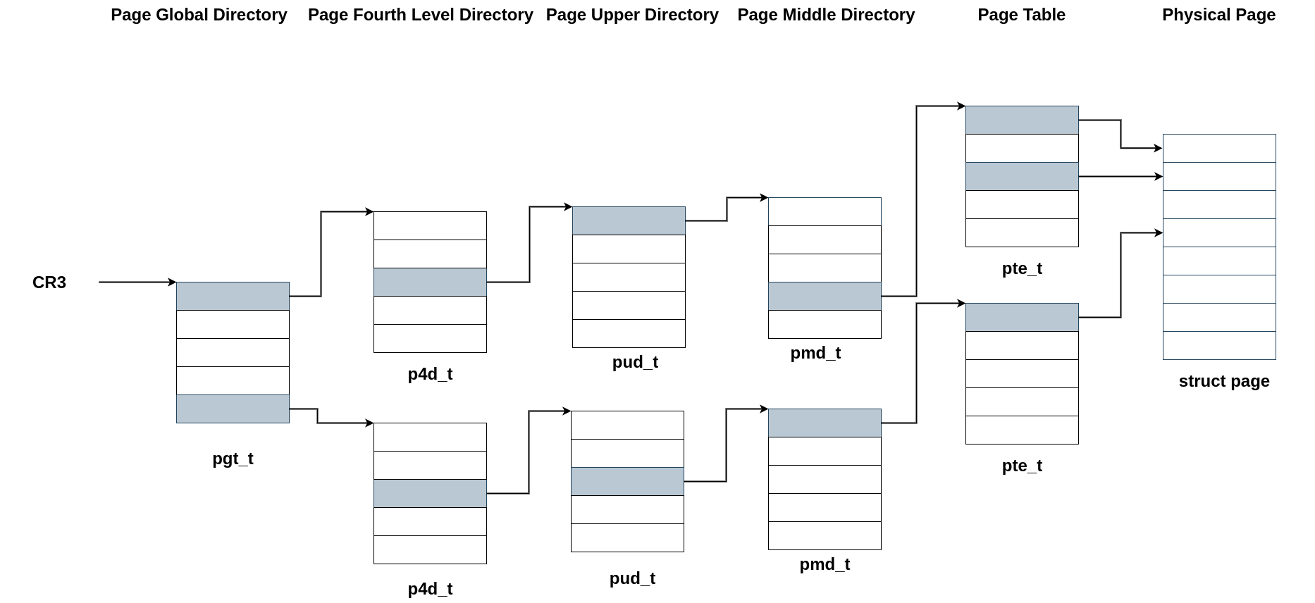それぞれ、Page Global Directory(PGD)、Page 4-Level Directory(P4D)、Page Upper Directory(PUD)、PMD(Page Middle Directory)、PTE(Page Table Entry)である。
