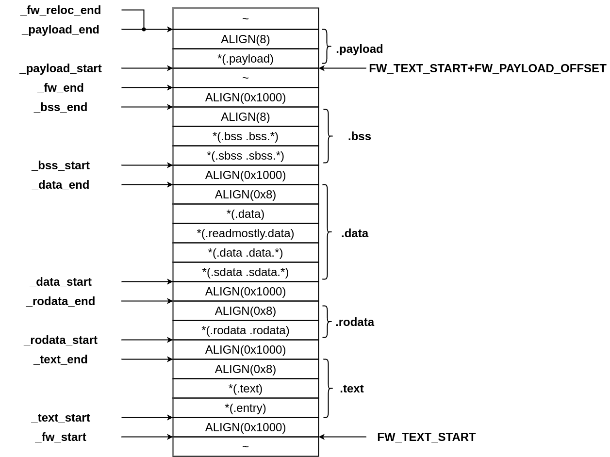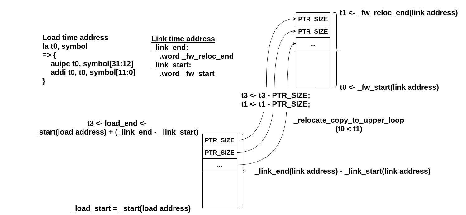 _link_start, _load_startは_fw_start自体の値を持っているため、リンク時の_fw_start = 0x80000000となる。la命令を用いたアドレス生成はauipc, addペアでPC-Relativeでアドレス生成がされるので、実行時のロードアドレスになる。